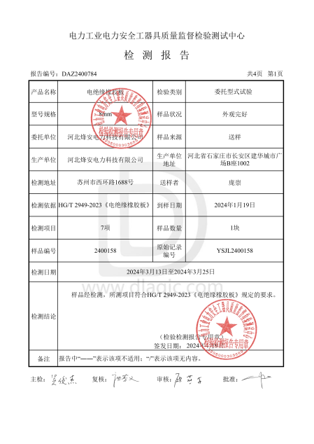 烽安电力绝缘胶垫的国标资质是遵循2024年2月最新执行的标准HG/T2949-2023,仅此一点就远超同行的已经作废1999标准。其检测机构更是国网投标指定的专属机构。检测项共计7项15个标准,包含外观质量、规格尺寸、电性能、硬度、拉伸强度、拉伸伸长率、热空气老化等,更全面,更安全。